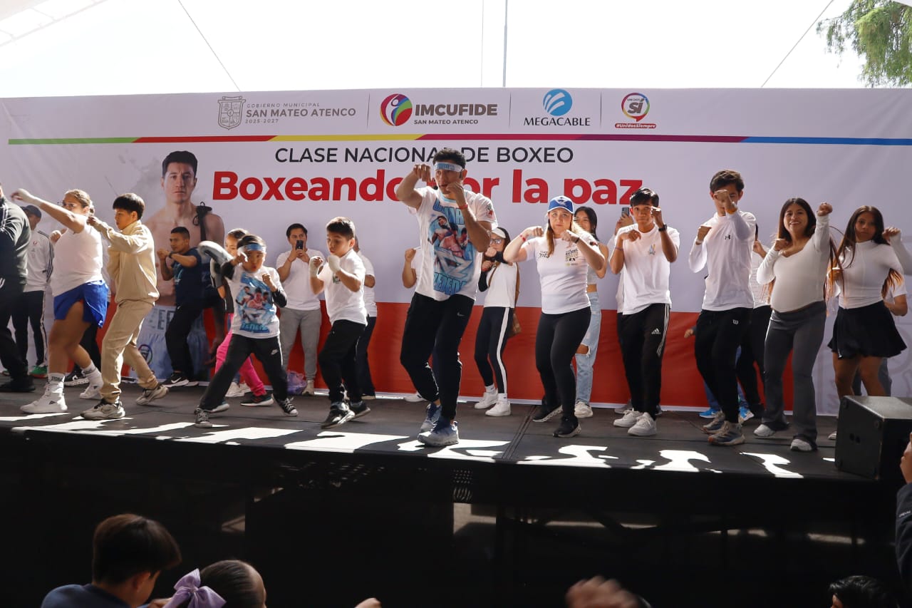 San Mateo Atenco, Estado de México, 6 de abril de 2025.- Más de 2000 personas se dieron cita en la Plaza Cívica Benito Juárez para participar en la Clase Nacional de Boxeo “Boxeando por la paz”, un evento sin precedentes que reunió a atletas, familias, autoridades y a la comunidad atenquense en torno a un mensaje claro: la paz se construye con disciplina, unidad y acción social.