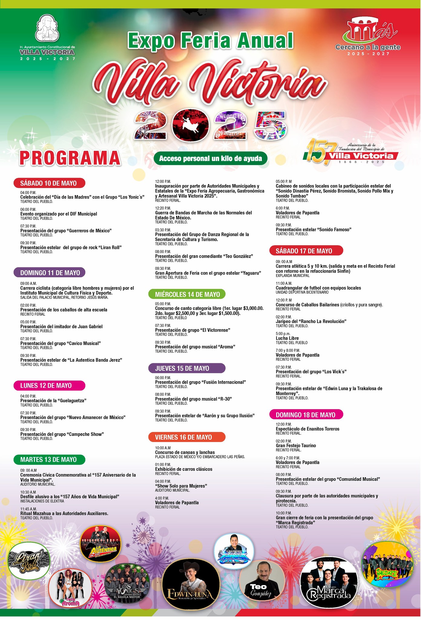 Este año, la feria conmemora el 157° aniversario de la fundación de Villa Victoria, ofreciendo una experiencia vibrante que resalta la riqueza cultural y las tradiciones de la región. Desde su inicio el pasado 10 de mayo, el evento ha destacado por su ambiente festivo y su propuesta inclusiva, con entrada gratuita a la mayoría de los espectáculos, lo que permite a familias y visitantes disfrutar de una amplia gama de actividades sin costo alguno.
