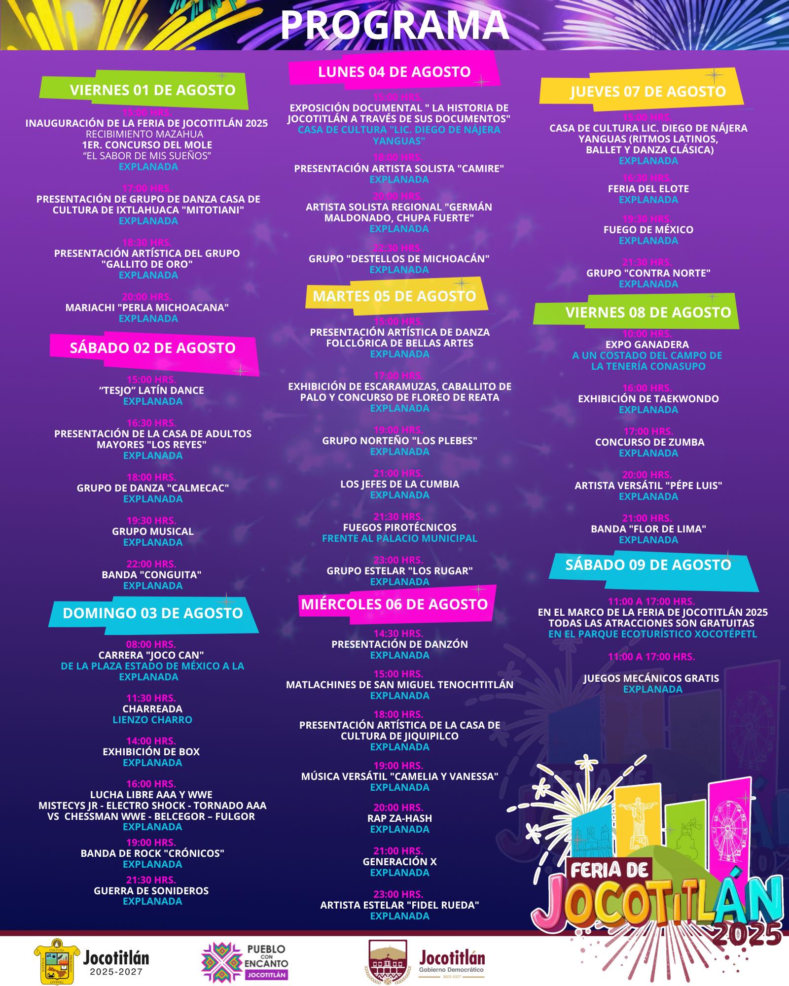 La Feria de Jocotitlán 2025 continúa esta semana con un programa lleno de actividades culturales, artísticas y turísticas, que se desarrollan en distintos espacios del municipio y culminarán el próximo sábado 9 de agosto.