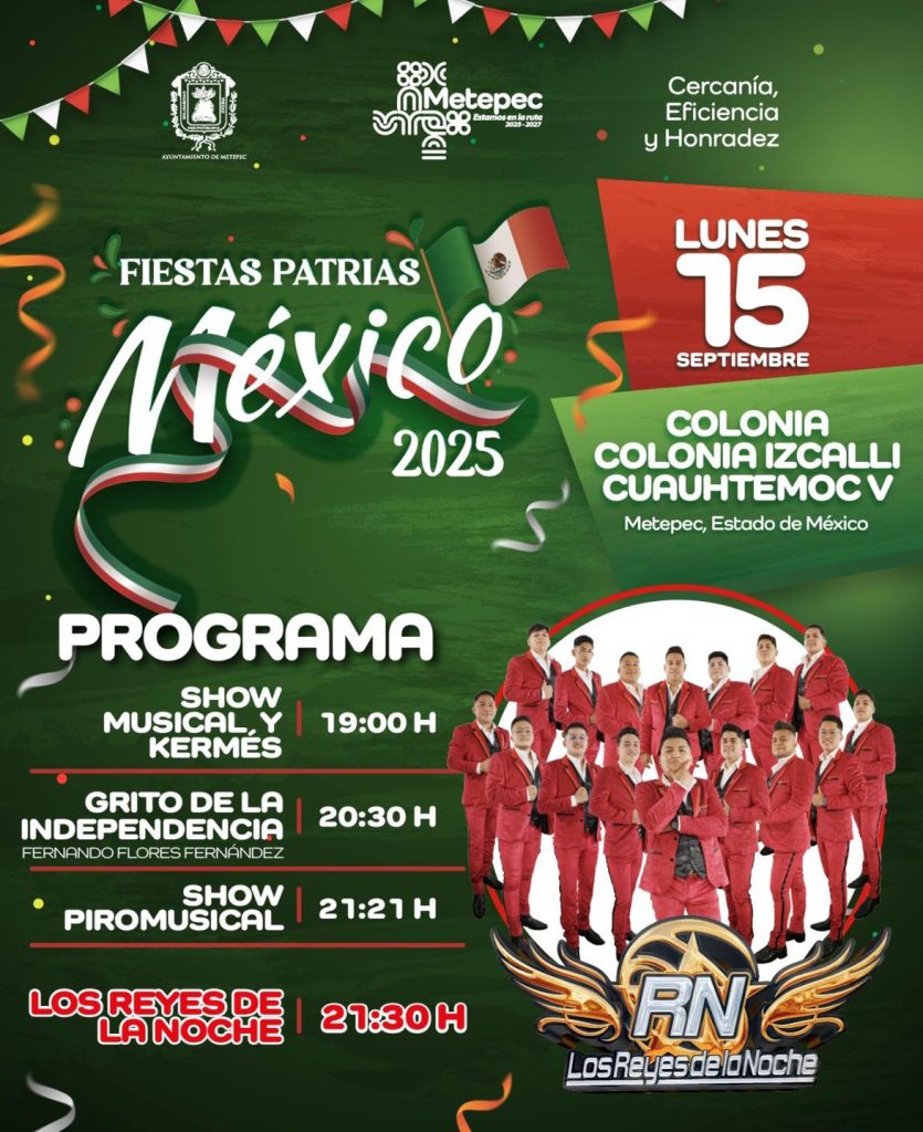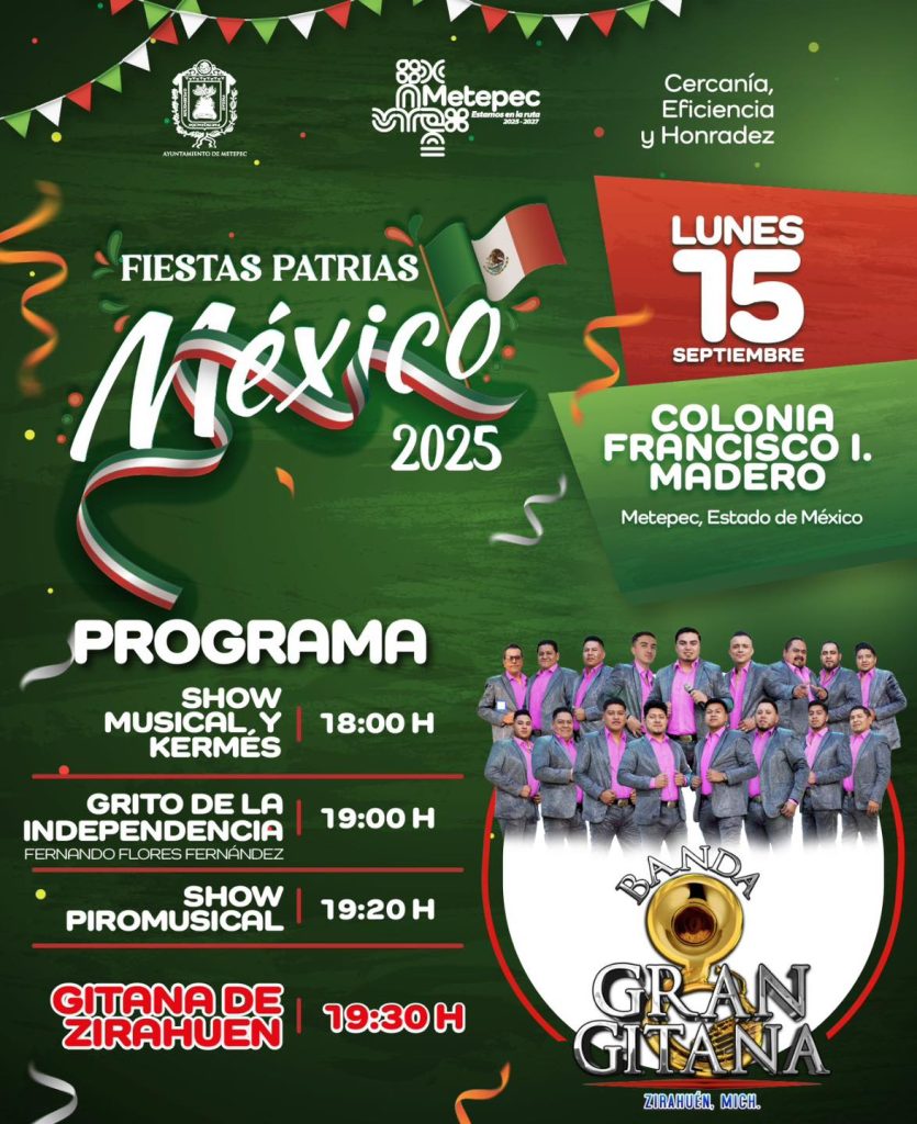 El Ayuntamiento de Metepec dio a conocer el programa oficial de actividades que se llevarán a cabo el próximo 15 de septiembre con motivo de las Fiestas Patrias, en distintos puntos del municipio.