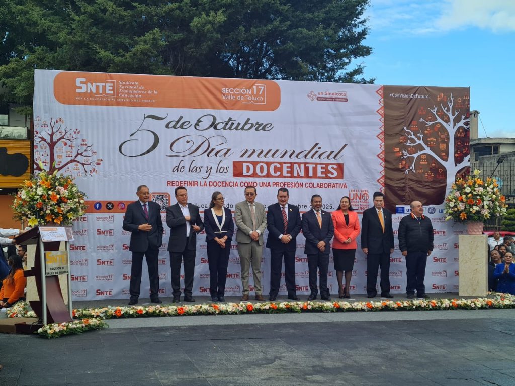 Toluca, Méx., 5 de octubre de 2025. — En el marco del Día Mundial de las y los Docentes, la Sección 17 del Sindicato Nacional de Trabajadores de la Educación (SNTE), correspondiente al Valle de Toluca, realizó este domingo un acto conmemorativo en el Monumento al Maestro de la Capital Mexiquense