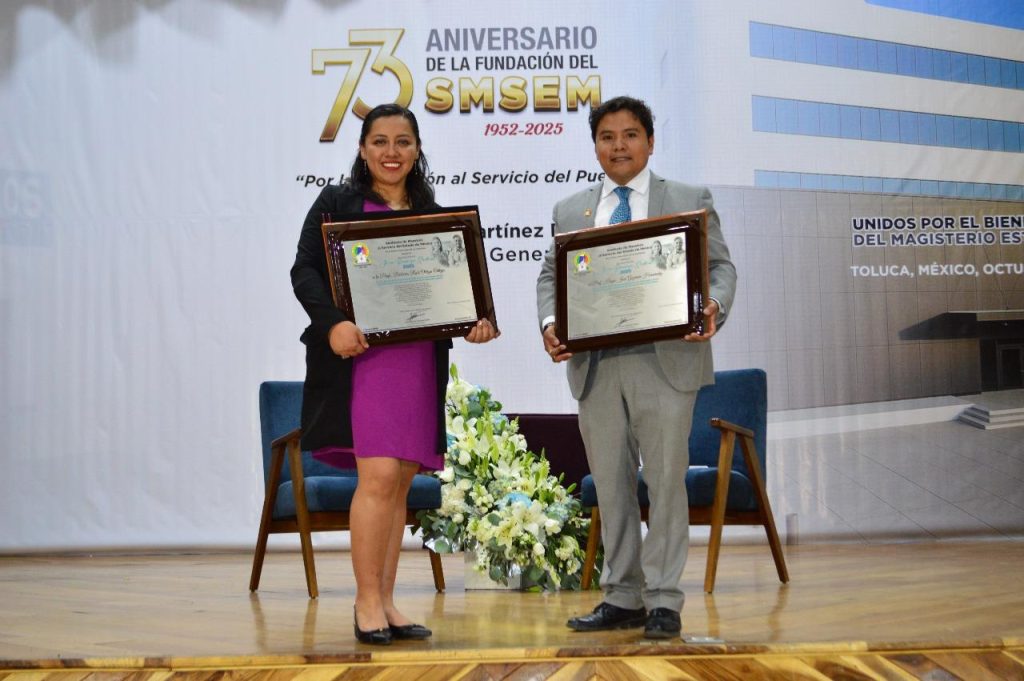 El galardón fue otorgado a los docentes Bárbara Rubí Ortega Ortega, de la Región Sindical 2, y Hugo José Guzmán Hernández, de la Región 8, durante una ceremonia celebrada en el Auditorio Forjadores de la Unidad Sindical. El evento estuvo encabezado por Jenaro Martínez Reyes, secretario general del SMSEM, y Miguel Ángel Hernández Espejel, titular de la Secretaría de Educación, Ciencia, Tecnología e Innovación.