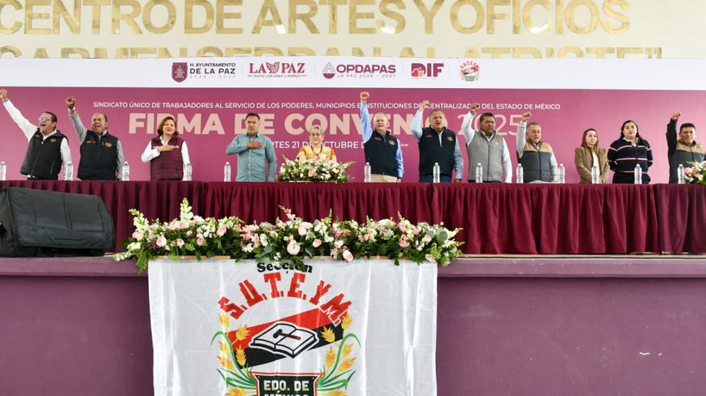 Toluca, Estado de México, 21 de octubre de 2025 — El Sindicato Único de Trabajadores de los Poderes, Municipios e Instituciones Descentralizadas del Estado de México (SUTEYM) y el Gobierno Municipal de La Paz firmaron el Convenio de Sueldos y Prestaciones Socioeconómicas 2025, con el objetivo de fortalecer la relación laboral y brindar certeza a las y los servidores públicos sindicalizados del municipio.